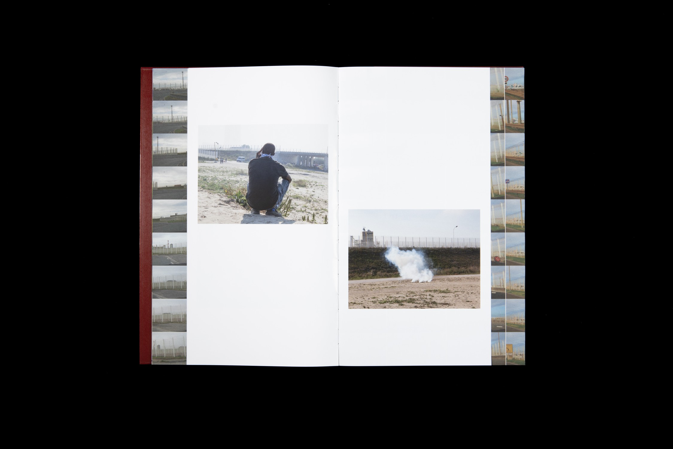 Calais is one of the bottlenecks for refugees in Europe. Among others people from Afghanistan, Eritrea, Somalia, and Ethiopia, from Iran and Syria find themselves stranded in the French port on their way to the UK. They are stopped by a complex border control regime comprising surveillance systems, fences, and police security—a landscape that has been given a military makeover thus collides with an improvised, temporarily erected living environment. In his new artist’s book Christoph Oeschger cuts together the perspectives and realities of border guards and refugees.