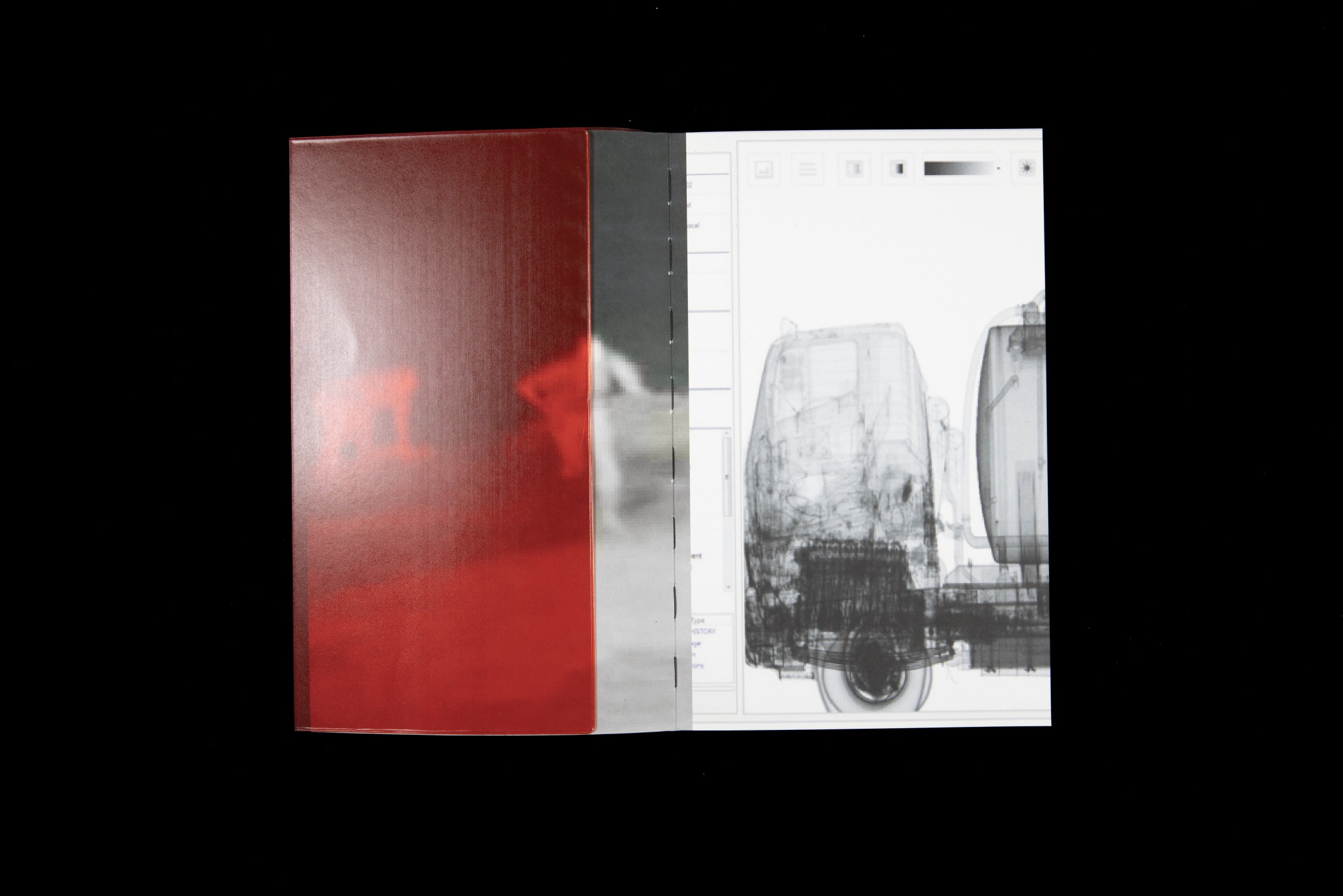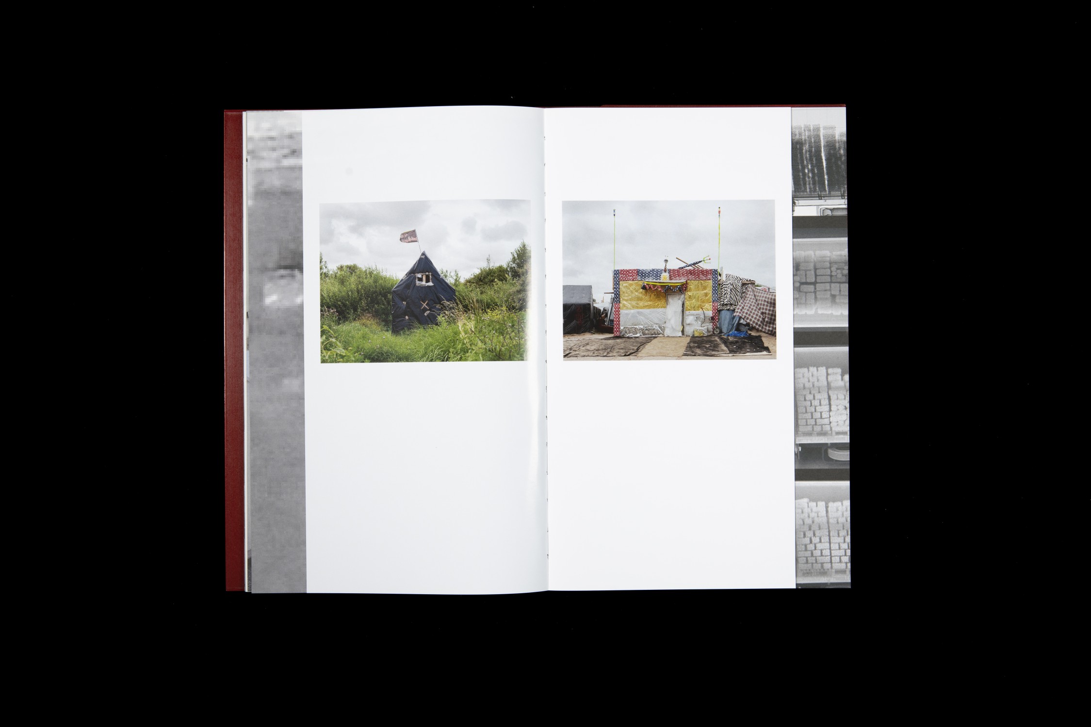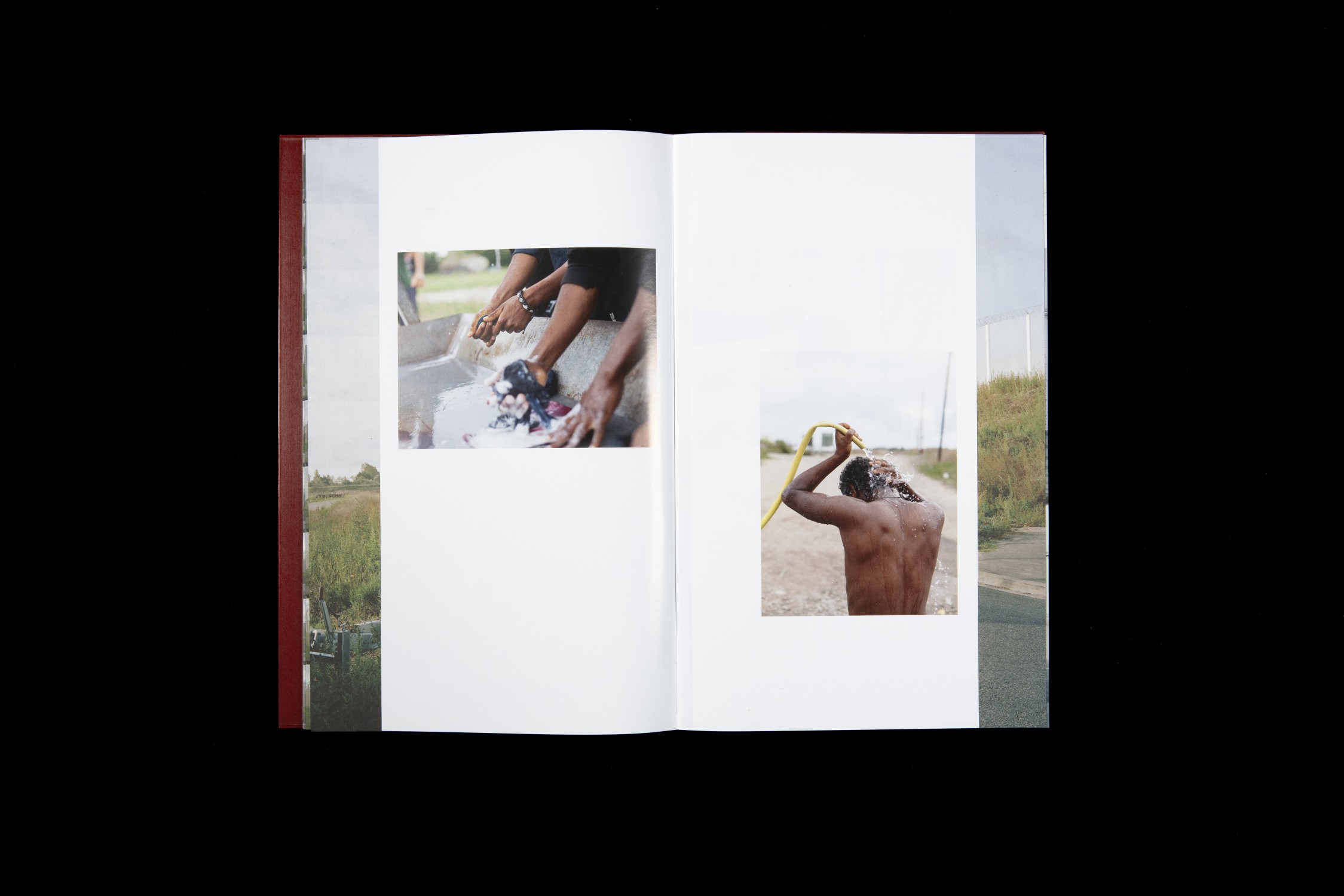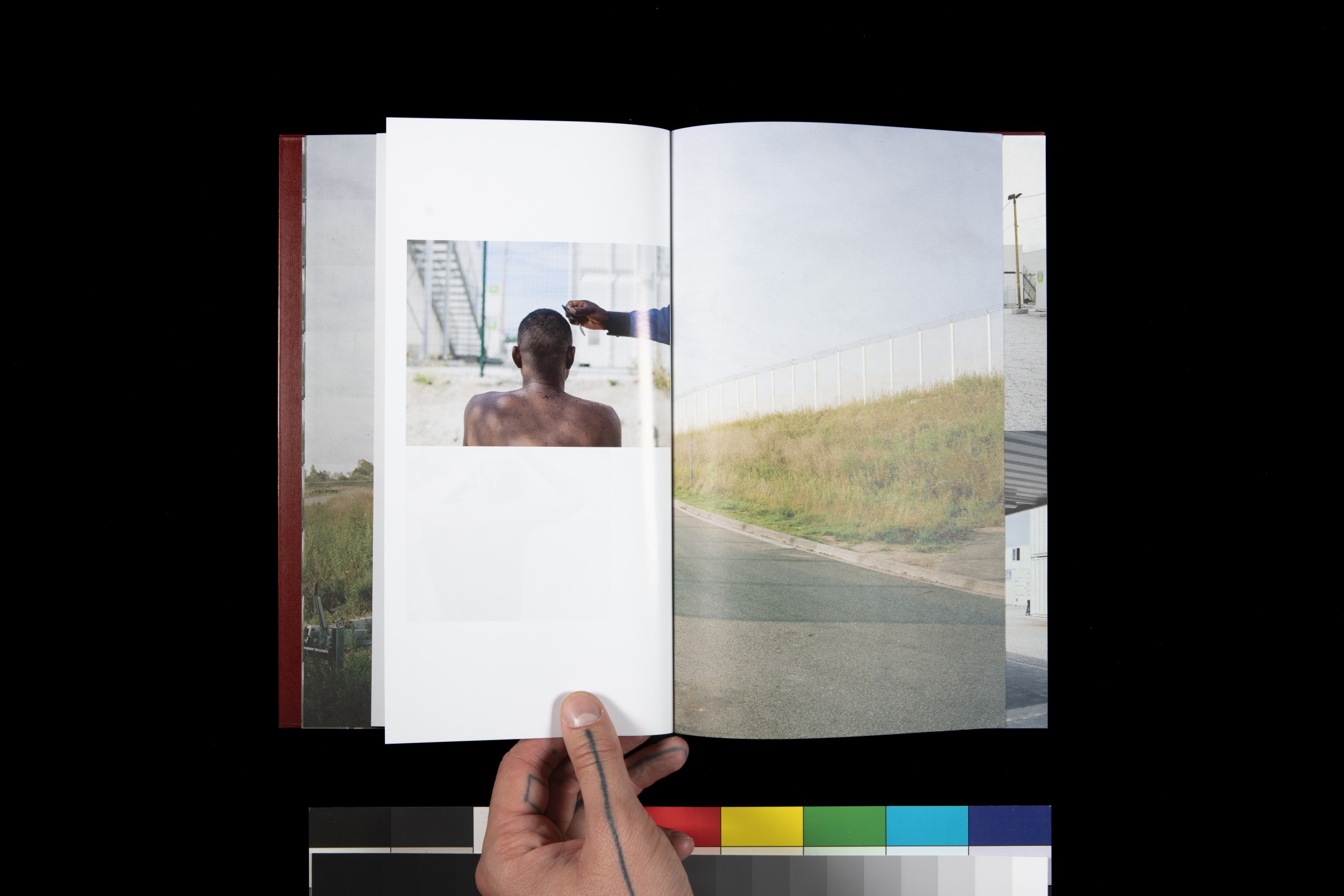 From spring 2016 until summer 2017, Oeschger observed the way political power structures operate in the border security systems and the impact and ramifications that they have. In his book the emptiness of the places he photographs and the absence of any dramatic scenes act as an echo chamber, reflecting the sense of void that is engendered by enforced waiting. We see the drive along the almost endless border installations around the harbour and Eurotunnel terminal, wide expanses of landscape cut through by fencing and walls, desolate containers used for housing, improvised huts, the indeterminate daily activities of the people who live there, and the traces they leave in the landscape. The pictures do not follow any chronological or geographical system. Oeschger intersperses his own photographs with technical shots of the surveillance that now plays a key role in border security. Thermal imaging cameras are used to scan the nocturnal landscape, and the flatbeds of lorries are examined with microwave X-ray technology. In these images people become wraith-like apparitions, just like the description one of the refugees gave to Oeschger to conjure up his situation in the camp: “They’ve made us ghosts.”